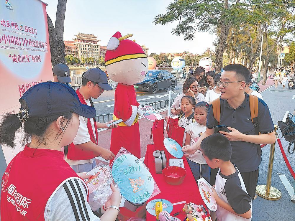10月2日,2025廈門中秋博餅鐺鐺車從中山路發車,前往集美學村龍舟池,拉開了廈門中秋旅游嘉年華"古風博餅"快閃活動的序幕。圖為游客被邀請參加博餅。福建日報記者 黃星榕 攝