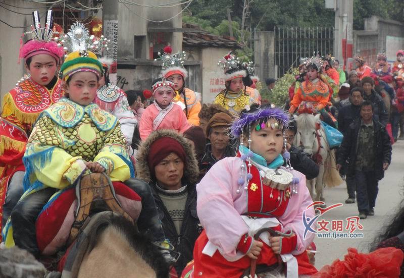 被譽(yù)為涵江歷史文化名村的的洋尾,每年從正月初九開始,六個(gè)自然村的各個(gè)角落就紛紛鑼鼓喧天、慶典不斷,輪流著開展小型的“分元宵”活動(dòng)。而作為“總元宵”出場(chǎng)的“跑二六”是重頭戲,由洋尾村的各家各戶雇上馬匹,讓自家十來歲的孩童畫上粉面、穿上古裝,扮飾成傳統(tǒng)的民間傳說和神話故事中的歷史人物,頸掛銀鎖,騎馬游鄉(xiāng)。每年這一天,在齊鳴的鞭炮聲中,巡游馬隊(duì)依據(jù)傳統(tǒng)的線路,熱熱鬧鬧地走過桃花艷麗的白塘湖畔,穿越古老的祖先祭祠與牌坊,沿途村民紛紛焚香化草、祈福禱告。