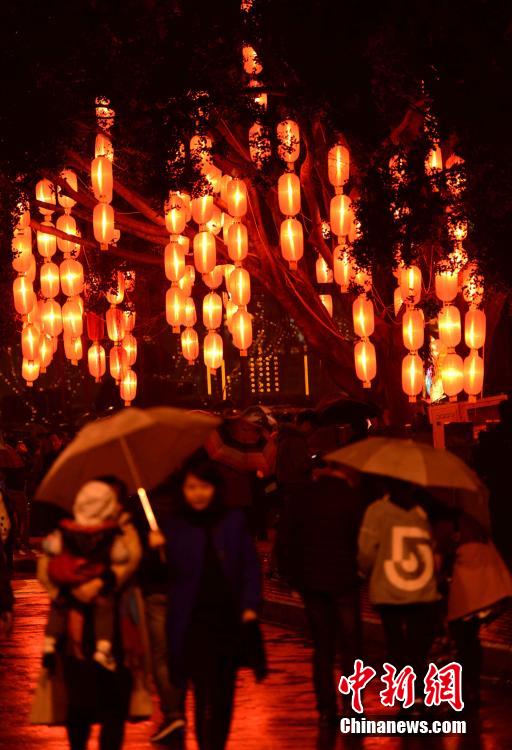 2月19日晚,福州元宵燈會璀璨上演,吸引數十萬民眾觀賞。今年福州元宵燈會按照五個行政區域,沿閩江兩岸布展,與閩江的夜景交相輝映,讓市民大飽眼福。圖為民眾冒雨觀燈。王東明攝