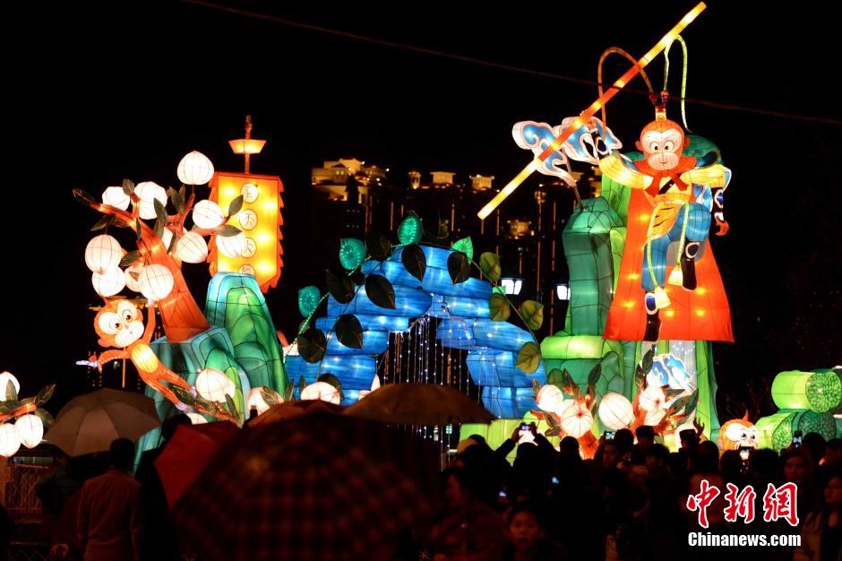 2月19日晚,福州元宵燈會璀璨上演,吸引數十萬民眾觀賞。今年福州元宵燈會按照五個行政區域,沿閩江兩岸布展,與閩江的夜景交相輝映,讓市民大飽眼福。圖為“金猴鬧春”燈組。王東明攝