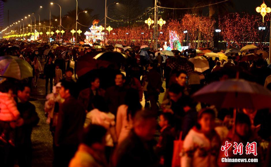 2月19日晚,福州元宵燈會璀璨上演,吸引數十萬民眾觀賞。今年福州元宵燈會按照五個行政區域,沿閩江兩岸布展,與閩江的夜景交相輝映,讓市民大飽眼福。圖為數十萬民眾前來逛燈展。王東明攝